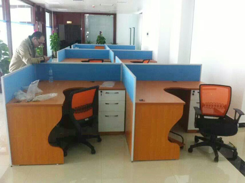 公司職員區(qū)采用思進家具板式辦公桌SUV02-PF3624訂做藍色屏風和櫻桃色膠板